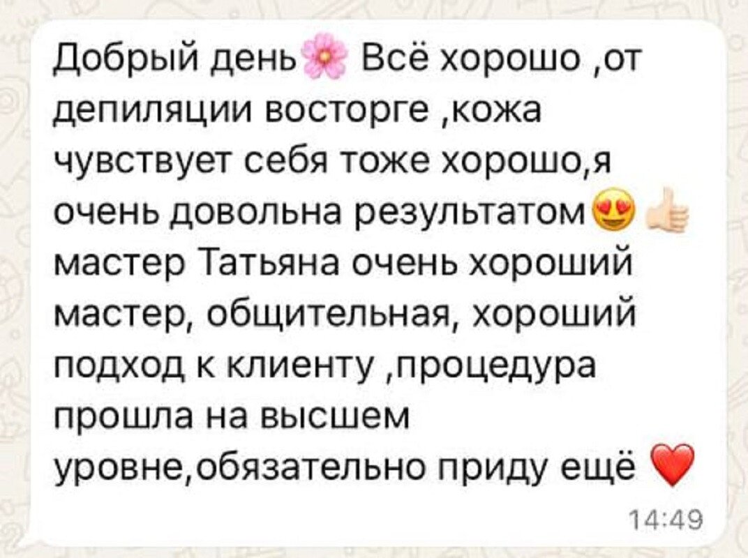 Богданова Татьяна как бьюти-специалист постарается сделать так, чтобы вы стали ее постоянным клиентом. Она предлагает такую услугу, как депиляция.